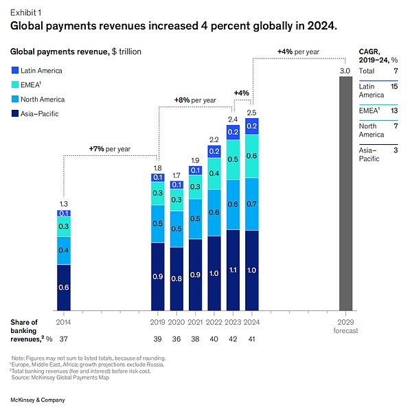 تشمل القوى الرئيسية التي تعيد تشكيل مشهد المدفوعات العمليات الأصلية للذكاء الاصطناعي وتحقيق الدخل من وكلاء الذكاء الاصطناعي، والنماذج الناشئة لسيولة الدفع القابلة للبرمجة، والعملات الرقمية المنظمة. أحد الاعتبارات الرئيسية هو التغييرات التي ستجلبها هذه القوى الناشئة على النماذج الحالية. يجب على مشغلي الدفع التركيز على المرونة والهندسة والثقة في أنظمة التحول الخاصة بهم. يجب عليهم أيضًا إعطاء الأولوية لكيفية الحصول على القيمة. I. إيرادات الدفع في الاقتصاد الجديد بين عامي 2019 و2024، ستنمو إيرادات الدفع العالمية بمعدل سنوي متوسط قدره 7٪. مدفوعًا بارتفاع أسعار الفائدة، سيشكل دخل الفائدة 46٪ من إجمالي الإيرادات في عام 2024. تباطأ النمو إلى 4٪ في ذلك العام، وهو أقل بكثير من 12٪ المتوقعة لعام 2023. ويعزى التباطؤ إلى ذروة أسعار الفائدة، وضعف الظروف الاقتصادية الكلية، والتوسع الهيكلي لطرق الدفع منخفضة العائد، والضغط المستمر على الرسوم. حسب المنطقة، نمت أمريكا اللاتينية بنسبة 11٪، وأوروبا ووسط أفريقيا (EMEA) بنسبة 8٪، وأمريكا الشمالية بنسبة 5٪ على التوالي، بينما شهدت منطقة آسيا والمحيط الهادئ (APAC) انخفاضًا بنسبة 1٪. وعلى الرغم من ذلك، لا تزال المدفوعات هي القطاع الفرعي الأكثر قيمة في القطاع المالي، بمتوسط عائد على حقوق الملكية يبلغ 18.9٪ في عام 2024، مع تجاوز بعض المؤسسات 100٪. ومع ذلك، مع بلوغ أسعار الفائدة ذروتها وانخفاضها في العديد من البلدان والتغيرات في سلوك الودائع، من المتوقع أن ينمو صافي دخل الفائدة بنسبة 2٪ فقط تقريبًا سنويًا (حتى عام 2029) ما لم تكن هناك صدمات كبيرة. في الوقت نفسه، ومع تزايد إقبال المستهلكين على الطرق منخفضة التكلفة، مثل التحويلات المباشرة للحسابات والمحافظ الرقمية، سيتباطأ نمو إيرادات المعاملات أيضًا. ويؤدي استمرار ضغوط الأسعار (خاصةً في النظام البيئي القائم على البطاقات)، وتشديد اللوائح، وتزايد تجارب الدفع عبر المنصات، إلى الضغط على نماذج الدفع القائمة على الرسوم. لذلك، نتوقع معدل نمو سنوي متوسط لإيرادات القطاع يبلغ 4% حتى عام 2029، وقد ينخفض إلى 3% في حال حدوث اضطرابات عالمية، أو يصل إلى 6% في حال تسارعت وتيرة نمو الإنتاجية. بمعدل نمو 4٪، سيصل إجمالي حجم السوق إلى 3.0 تريليون دولار بحلول عام 2029.