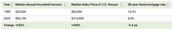 Comparison of Median Income, Home Prices, and Mortgage Rates in the US in 1985 and 2025|Source: Visual Capitalist