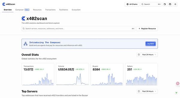像 Etherscan 的区块链浏览器,专门记录 x402 的支付和资源,比如谁在用 x402、买了啥。