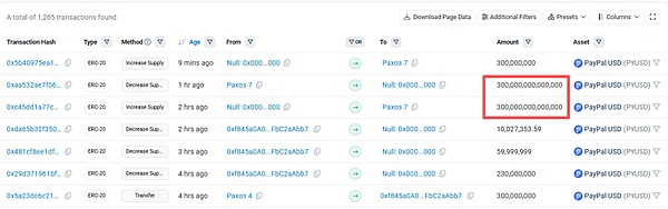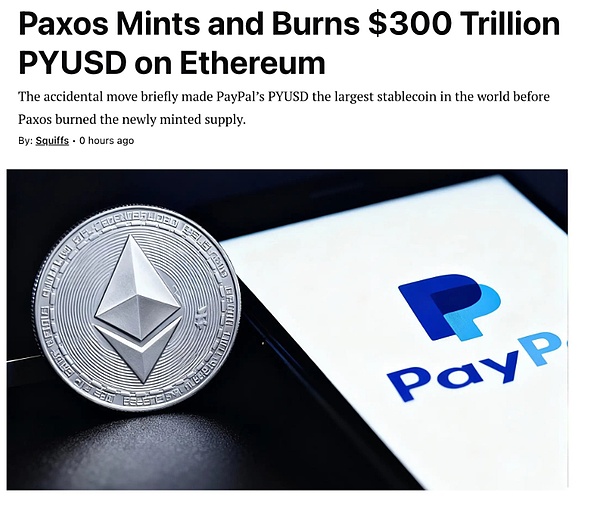 Cointelegraph也表示:恭喜PayPal 成为地球上最富有的公司,资产达 300 万亿美元……持续约 20 分钟,直到 Paxos 烧毁其刚刚铸造的价值 300 万亿美元的 PYUSD 稳定币。