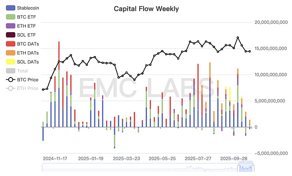 在新市场结构中,承接抛压的主要力量DATs公司和BTC Spot ETF通道资金本周本周表现同样疲弱。据eMerge Engine统计,本周流入加密市场的总资金仅为9.43亿,为数月来最低。
