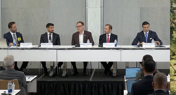 从左至右分别是Jito Labs的首席法务官丽贝卡·雷蒂格、Chainlink的联合创始人谢尔盖·纳扎罗夫、Lead Bank CEO杰基·雷塞斯、Fireblocks的CEO迈克尔·肖洛夫、纽约梅隆银行的资金服务与存托凭证全球主管詹妮弗·巴克