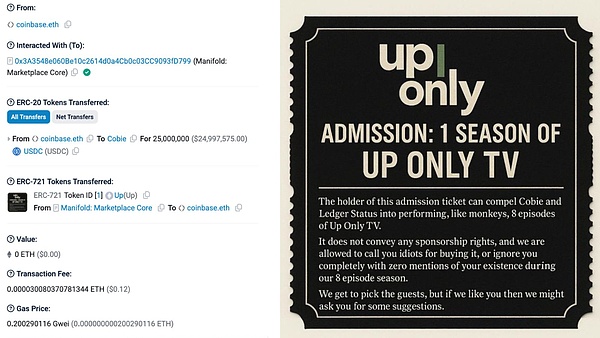 2025 年 10 月 21 日,一个标记为「coinbase.eth」的以太坊钱包,向加密货币 KOL Cobie 转出了 2500 万 USDC,用于购买一个叫名为 UpOnly 的 NFT。