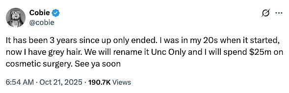 一小时后,Cobie 在 X 上发了一条推文:「UpOnly 结束已经三年了。开始做节目时我才 20 多岁,现在我都有白头发了。我们要把它改名叫『大叔专场』(Unc Only),然后我会花 2500 万美元做整容手术。回头见。」
