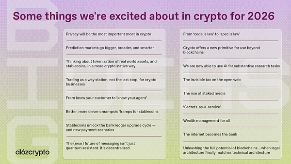 当然,a16z 报告所提出的远不止这几个方向。本文重点选取了其中 4 个我们认为更具代表性的趋势进行展开,而其他方向同样值得关注,例如:稳定币出入金升级、RWA 加密原生化、稳定币带动银行账本系统升级、财富管理多元化、AI 研究助理兴起、AI代理实时内容分润机制、去中心化抗量子通信、“隐私即服务”成为基础设施、DeFi 安全范式转变、预测市场智能化、可验证云计算、看重产品市场契合度(PMF)、加密法案将释放区块链更多潜力。