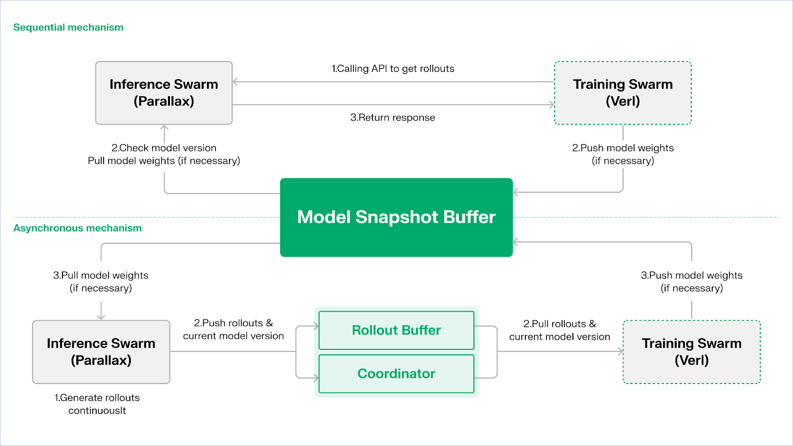 通信スパースで並列可能なロールアウトは、世界中のコンシューマーGPUに委託され、高帯域幅のパラメーター更新は、Prime Intellectの非同期アクターラーナーからGradient Echoのデュアルクラスターアーキテクチャまで、少数のトレーニングノードに集中されます。