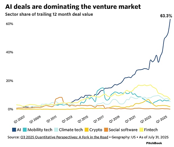 벤처 캐피탈의 세계에서 돈은 항상 가장 높은 수익률을 추구하는 방향을 쫓아왔습니다. AI의 골드러시는 전례 없는 자본의 블랙홀을 만들어냈습니다. PitchBook에 따르면 2024년에는 전 세계 벤처 캐피탈의 약 3분의 1이 AI에 투자되고, 2025년 상반기에는 그 비율이 미국에서는 무려 3분의 2로 늘어날 것으로 예상됩니다.