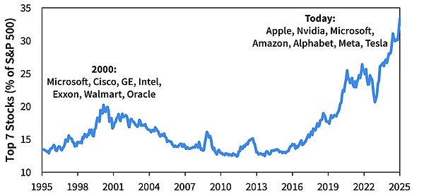 시점별 S&P 500 상위 7개 종목의 총 비중|출처: Sparkline