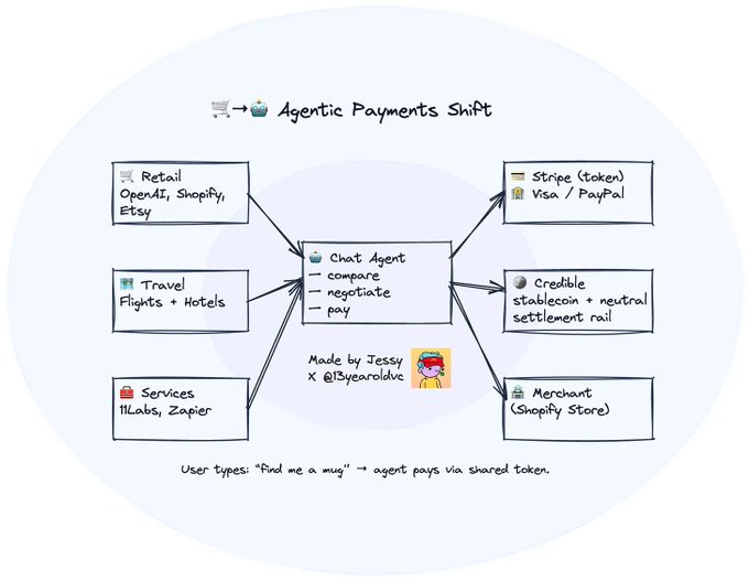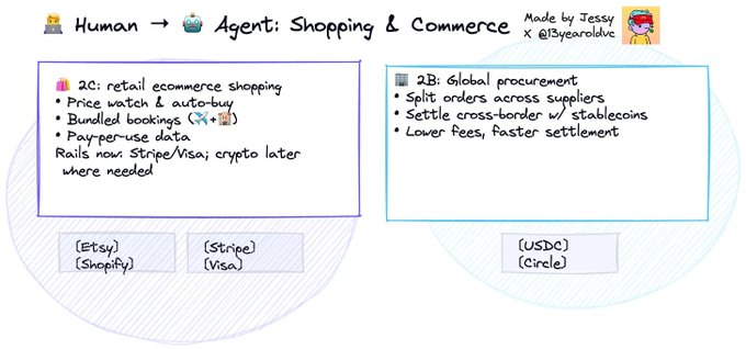 단기적으로는 이러한 결제 프로세스의 대부분은 여전히 Stripe 또는 Visa와 같은 기존 채널을 통해 이루어질 것이며, 이는 괜찮습니다. 소매 이커머스(2C)의 경우, 적어도 현재로서는 기존 인프라만으로도 '사람 → 에이전트' 인터페이스를 지원하기에 충분합니다.