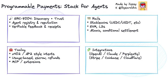 우리는 에이전트 A가 ERC-8004 레지스트리를 통해 에이전트 B를 찾아 서비스를 협상한 다음, x402와 같은 스마트 결제 프로토콜을 통해 즉시 결제를 완료하여 이더의 중립 금융 계층에 정산하는 미래를 믿습니다.