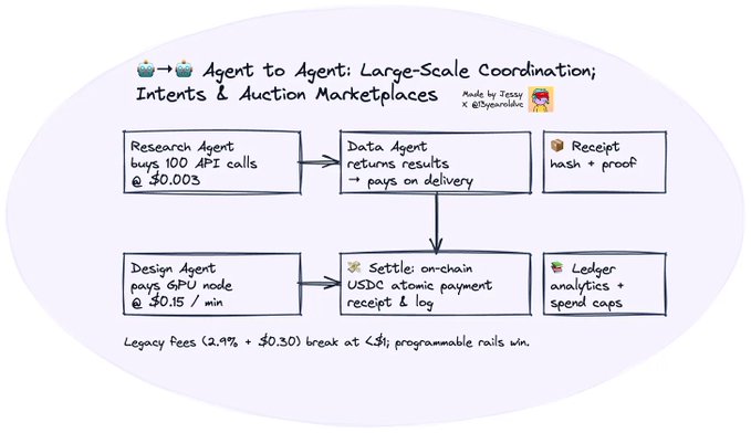 연구 에이전트가 데이터 에이전트로부터 100개의 API 호출을 구매하고, 디자인 에이전트가 컴퓨팅 노드에 GPU 사용료를 지불한다고 상상해 보십시오. 이러한 트랜잭션은 기계 간 트랜잭션으로, 빈도가 높고 금액이 작습니다.