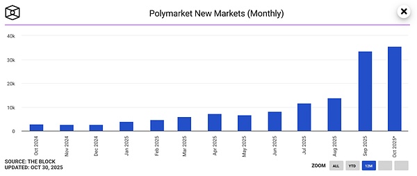预测市场最大的优势是其多样性—万物皆可预测,例如无门槛的 Polymarket 上,其平台创建活动在 2025 年经历了爆炸性增长。从 2024 年每月仅有数百到上千个新市场的平稳状态,激增至 2025 年下半年每月创建超过 1 万个新市场的火热现状。这证明了平台极高的活跃度和社区参与度,用户正在以前所未有的速度,将现实世界的各类事件转化为可交易的市场。