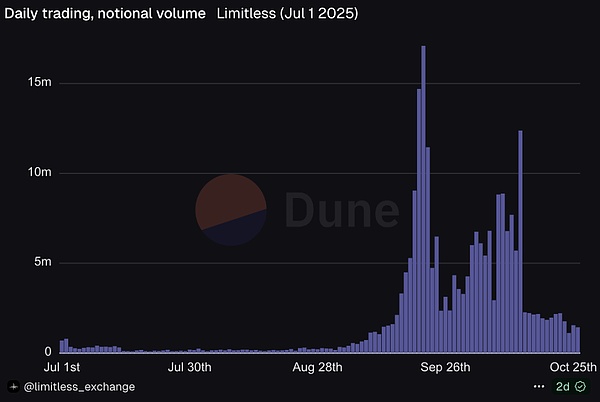 作为 Base 生态独苗且获得 Coinbase Ventures 与 Base Eco Fund 双重资金扶持,按常理来讲,Limitless 的发展是有不小的保障。然而,Limitless 团队成员在市场和 post-TGE 的糟糕策略葬送了这些优势。先是创始人公开曝光私人群组的消息以试图揭露上币费用而引发了与 Binance 的公开争斗,甚至把事件一度扩大至 Coinbase 与 Binance 在交易所层面的明争暗斗,最终是 Coinbase 以上线 Binance 平台币 BNB 作为友好结束,但 Limitless 损失的品牌价值是难以挽回的。LMTS 代币也在几乎没有任何主流 CEX 支持的情况上直接选择在 DEX 上线。在代币上线后,Limitless 团队又因为“链上 MM 策略”而被社区质疑,社区认为所谓的 MM 策略实际就是团队在高抛低吸。 一连串的争议事件后,Limitless 日交易量从超过 500 万甚至上千万美元下滑至百万美元出头。