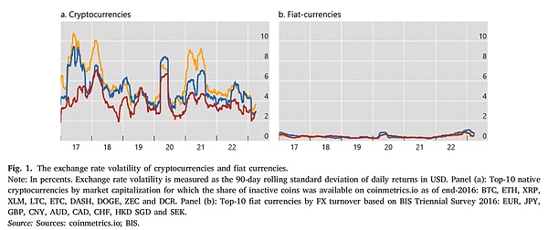 加密货币自诞生以来,价格波动性远高于传统法定货币,已成为学界与业界的关注焦点。如图1所示,主流加密货币如比特币、以太坊的日收益率标准差时常突破10%,而主要法定货币的波动率大多维持在1%以下。这种极端波动性不仅影响了投资者的风险预期,也促使监管机构如巴塞尔银行监管委员会对银行持有的加密货币资产施加最高风险权重。传统研究将波动性归因于加密货币供给缺乏弹性或不同币种间的转换便利性,但这些视角未能深入揭示持有者动机与市场结构之间的内在联系。本文在此基础上,提出“加密乘数”这一核心概念,旨在从均衡角度刻画投资者资金流动对加密货币市值的系统性影响。