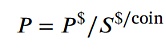 电信技术让商家在顾客结账时,能近乎实时地更新其需支付的硬币数量。当接受加密货币支付时,商家只需通过将购买金额(P美元)除以该加密货币的最新汇率(P美元/枚),即可计算出顾客需支付的加密货币单位数S,也就是: