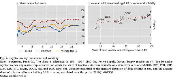 加密乘数的理论构建基于一个关键观察:加密货币虽可作为支付工具,却极少作为计价单位。在实际交易中,商品价格通常以法币标价,而加密货币支付数量则随汇率实时调整。这一特性使得加密货币的汇率形成机制与传统货币有所不同,也为乘数效应的产生提供了土壤。加密乘数的大小反映了市场对投资性需求的敏感程度:当绝大多数代币被囤积而非用于支付时,即便是小额资金流动也可能引发市值的剧烈变动。文章进一步利用区块链数据验证了这一理论,并指出当前主流加密货币中,超过75%的比特币与60%的以太坊在过去六个月内未曾参与支付,暗示其乘数可能极高。