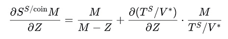 在汇率方程基础上,作者进一步引入两个假设:代币总供给M对市场条件无弹性(假设3,适用于比特币等发行规则预设的加密货币),以及投机性持有Z的变动不会永久影响以美元计价的支付需求 Ts/V*(假设4)。在此条件下,可推导出加密乘数的表达式: