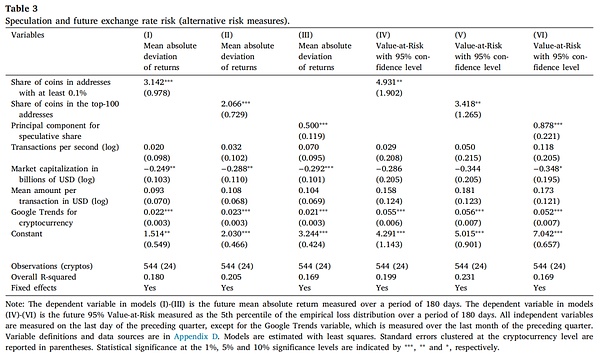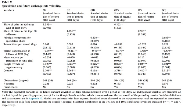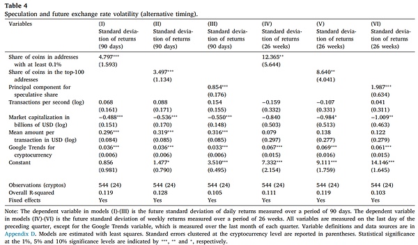 为验证加密乘数的现实相关性,作者选取24种区块链原生代币,收集其2014年至2023年的季度数据,涵盖价格、区块链交易与地址余额等信息。被解释变量为未来180日收益率的年化标准差,核心解释变量为三个投机持有比例的代理变量,分别为:地址余额超过总供给0.1%的代币份额;前100大地址持有的代币份额;基于上述变量及“余额超100万美元地址份额”与“小额地址数量”构建的主成分变量。