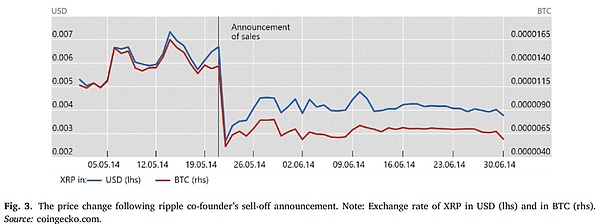 加密乘数的核心政策含义在于警示市场参与者审慎评估大额加密货币持仓的流动性风险。理论表明,大规模投机头寸的平仓可能对价格产生显著冲击,除非有其他投机者承接。这一风险在现实案例中得以印证:2014年,Ripple联合创始人McCaleb宣布计划出售其持有的9% XRP代币后,尽管供给面最大增幅仅为10%,XRP汇率在公告后暴跌逾40%。Ripple最终通过法律协议将其出售计划延长至七年以上,以缓解市场压力。
