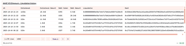 我们同时通过第三方数据分析平台对 Aave 的清算情况进行了追踪。数据显示,尽管在市场暴跌期间(2025 年 10 月 10 日至 11 日)Aave 的整体清算量高达 1.92 亿美元,但其中与 USDe 和 sUSDe 相关的清算事件极少,几乎可以忽略不计。
