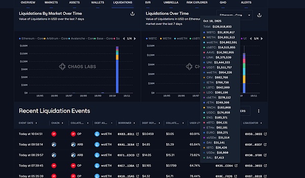 在另一风险分析平台 Chaos Labs 的监测数据中,同样可以看到 Aave 的清算活动,但其中 并无与 USDe 和 sUSDe 直接相关的清算记录。