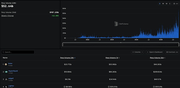 데이터 성과 관점에서 보면, 9월 14일 3억 7천만 달러였던 Aster의 TVL은 328% 증가한 17억 3천 5백만 달러로 급등했으며, BNB 체인이 자금의 80%에 기여한 것으로 나타났습니다. 일일 거래량은 200억 달러를 여러 차례 돌파했으며, 24시간 수수료 수입이 712만 달러로 하이퍼리퀴드를 제치고 세계 최대 무기한 DEX로 등극하기도 했습니다. 더 중요한 것은 Aster가 불과 몇 달 만에 193억 8,300만 달러의 누적 영구 거래량을 기록했다는 점인데, 이는 하이퍼리퀴드의 2조 7,600억 달러에는 아직 한참 모자라지만 인상적인 속도로 성장하고 있다는 점입니다.