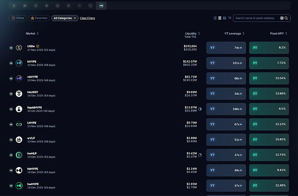 인터랙션: app.pendle.finance를 통해 프로토콜에 액세스하고 하이퍼리퀴드 네트워크를 선택하는 사용자는 다음을 수행할 수 있습니다. PT/YT는 kHYPE과 같은 이자 수익 자산을 분리하거나 유통 시장에서 직접 이러한 수익 상품을 거래할 수 있습니다. 이 프로토콜은 직관적인 수익률 곡선과 만기 정보를 제공하여 사용자가 투자 결정을 내리는 데 도움을 줍니다.