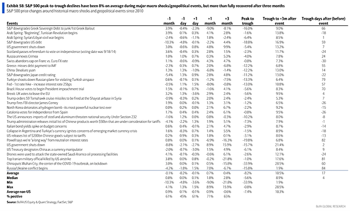 은행 오브 아메리카의 한 보고서는 역사적으로 주요 매크로 충격/지정학적 사건 발생 시 S&P 500의 성과를 검토한 결과, 이러한 주요 사건 발생 시 S&P 500은 평균 8%의 최고점에서 최저점까지 하락했지만 3개월 후 평균 10.5%의 회복세를 보였다고 지적했습니다. 사건이 발생한 후 시장이 저점에 도달하는 데 걸린 평균 일수는 17일, 중앙값은 4일에 불과했으며 이스라엘-팔레스타인 분쟁으로 인한 하락은 그보다 더 오래 걸린 것으로 보입니다