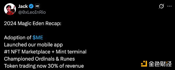 공동 설립자 Jack은 X에서 2024년 기준으로 토큰 거래 수익이 이미 전체 수익의 30% 이상을 차지한다고 말했습니다. 이는 NFT 거래 수수료에만 의존하던 과거 모델에서 크게 변화한 것입니다. 이러한 변화는 2025년 게임 기능을 추가하여 엔터테인먼트 플랫폼으로 성장하는 매직에덴이 계속될 것입니다.