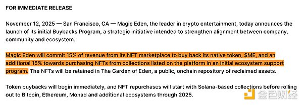 매직에덴은 2025년 11월 13일에 '바이백 계획'을 발표했습니다. "을 발표했습니다. 이 프로그램의 아이디어는 간단합니다: 회사가 생태계 가치를 지원하기 위해 수익을 재투자한다는 것입니다. Magic Eden은 다음과 같은 구조를 통해 NFT 시장 수익의 30%를 환원하기로 약속했습니다.
