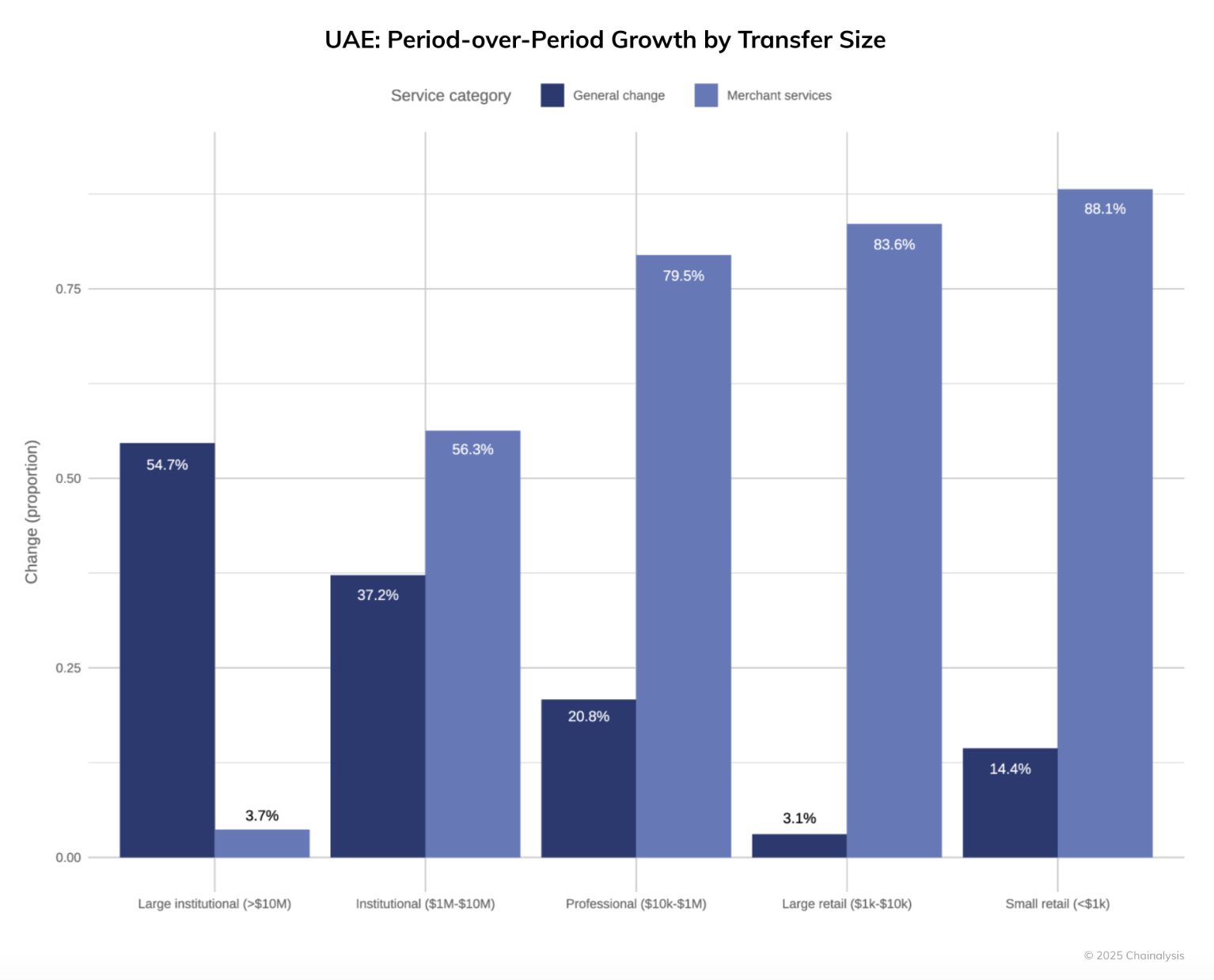 아펙스 프로토콜의 새로운 연구에 따르면 인구의 25.3%가 암호화폐를 보유하고 있으며, 최근 몇 년간 전체 보급률이 210% 이상 증가했고, 체인널리시스(Chainalysis)의 최신 글로벌 암호화폐 지리학 2025 보고서에 따르면 2024년부터 2025년까지 UAE로의 암호화폐 유입이 크게 증가할 것으로 예상됩니다. UAE는 2024년부터 2025년까지 560억 달러 이상의 암호화폐가 유입되어 MENA(중동 및 북아프리카) 지역에서 두 번째로 큰 암호화폐 시장으로 확고히 자리 잡을 것으로 예상됩니다. 이러한 성장은 주로 전년 대비 54.7% 증가한 기관 거래에 의해 주도되었습니다. 한편, 소규모 및 대규모 소매 거래도 각각 88.1%, 83.6% 증가했습니다.