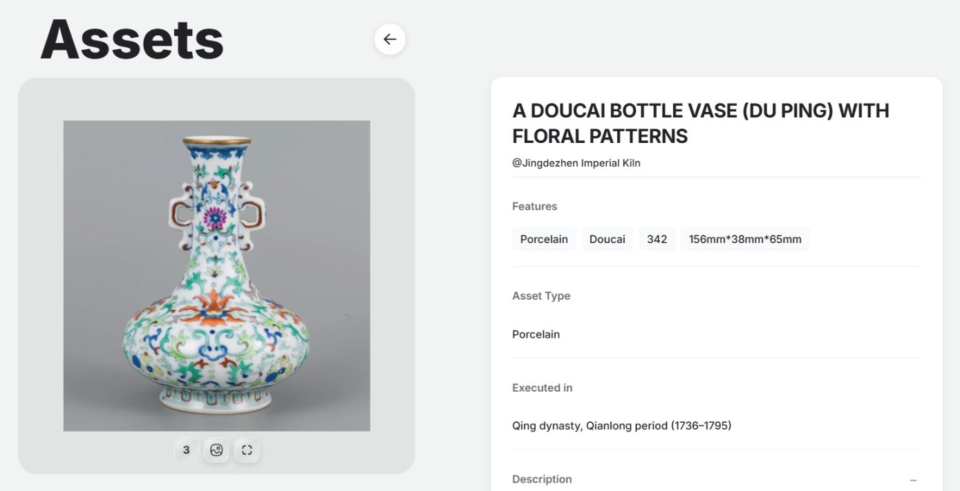 유틸란드의 첫 번째 시장 사례는 청나라 건륭 시대의 '도카이 탕즈화 쌍귀 평배병'에 해당하는 예술품 RWA 프로젝트인 EMQL입니다. 원래 틈새 수집가들의 아이템이었던 이 화병은 건륭황제가 사랑하는 후궁에게 애정을 표현한 토큰으로 알려져 있으며, 현재 홍콩에서 오프라인으로 호스팅되고 있습니다. 울티랜드는 이를 온체인에서 1백만 개의 아트토큰으로 분할하고, 아트토큰당 0.15 USDT의 구독 가격으로 제공하여 원래 폐쇄 시장에서만 구매할 수 있었던 자산을 온체인에서 구매할 수 있게 했습니다.