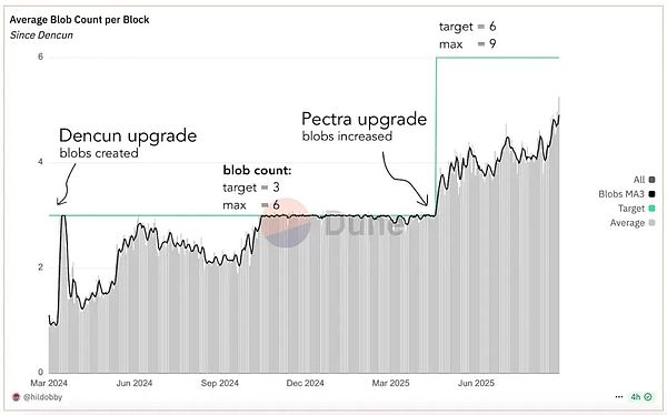 Khi blob đầu tiên được thêm vào mạng trong quá trình nâng cấp Dencun, có 3 (tối đa 6). Sau đó, con số này được tăng lên 6 (tối đa 9) trong quá trình nâng cấp Pectra. Sau Fusaka, số lượng có thể tăng lên ở mức ổn định mà không cần phải nâng cấp mạng lưới lớn hơn nữa.
