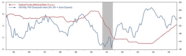 1990年代中后期,宽松货币环境助推了电信泡沫。自1987年就任美联储主席以来,格林斯潘的所谓“格林斯潘下跌保护”(Greenspan Put)逐步为市场所认识。其含义是,在金融市场遭遇危机时迅速降息以支撑经济和股市,而在资产泡沫膨胀之际则保持观望。这种政策不对称性使投资者相信下行风险将由美联储承担,从而倾向于采取更具冒险性的投资策略。同时,美国经济在1991年至2000年间经历了战后最长的扩张周期,失业率降至4%以下,通胀率维持温和。在此“金发姑娘经济”(Goldilocks economy)背景下,格林斯潘将联邦基金利率保持在相对低位:1993年至1994年短暂加息后,1995年至1999年政策利率稳定在4.75%至6%的区间,实际利率(扣除通胀)处于2%至3%的历史低水平