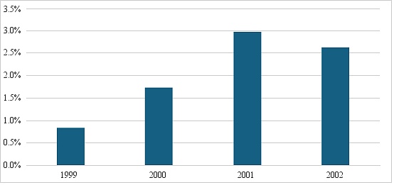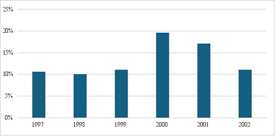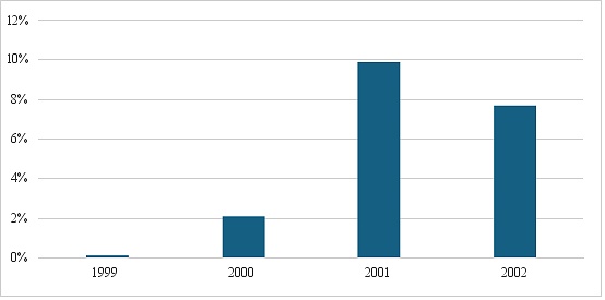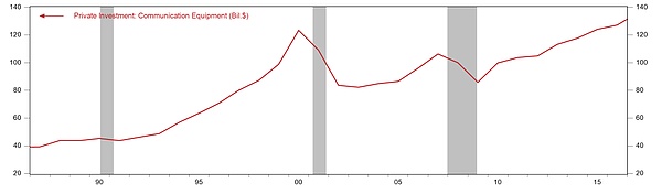 通信设备公司在 2001 年和 2002 年新经济崩溃时都经历了剧烈的下滑,重要原因是美国电信业资本设备支出(CAPEX)出现急剧下滑。1995-2000 年,通讯领域资本开支年复合增长率达到 23%,而 2000-2003 年则下降了 28%。前期的过度投资使美国企业整体的通信设备投资经历了漫长的低迷期,直到15年后的2015年才超过了2000年的水平。