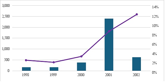 将上述三类减记合并来看,朗讯的三类拨备合计从1999年末的10.6亿美元激增至2001年的45.6亿美元,短短两年间增幅达330%,占Lucent营收的比例从2.8%暴升至21.4%。这大致意味着,Lucent在2001年获取的每1美元营收中,平均大约2毛钱需要用于覆盖各类资产减值。