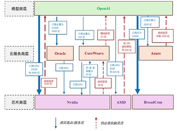 当年的下游企业CLECs普遍依赖供应链融资和其他融资方式。在1999 年,CLECs 的资本支出高达151 亿美元,而同期营收仅为 63 亿美元。这意味着它们每赚1美元,就要花 2.搞建设,超过 60% 的建设资金必须通过外部融资或债务来解决。今天,天文数字级别的资本支出更是远超大模型企业的营收能力。以OpenAI为例,其2025年预计营收约130亿,而未来10年预期的资本开支高达1万亿美元。这种使得其不得不依靠上游企业提供的“供应链融资”,从而形成了循环融资生态。从目前AI领域的循环融资生态看,可大致分为两个类型。