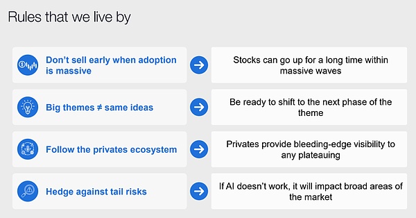 三是从宏观流动性层面看,美联储在未来12个月内还将维持偏宽松的货币政策,不会选择“主动刺破泡沫”。目前美国就业市场放缓迹象明显,月均新增就业人数由2024年的20万左右大幅降至目前的3万附近,这背后既有移民驱逐政策带来的“劳动力供给减少”,也有AI革命对初级员工的替代效应,还有极宽松财政政策招致的“养懒汉”效应。但另一方面,AI投资和财富效应使得整体消费与投资并不弱,GDP反而高增,美国经济呈现显著的“就业冷、增长强”的双速经济(two-speed economy)。由于美联储的双目标是物价稳定和充分就业,因此即便经济增长很强,只要就业偏软,美联储就更有可能维持偏宽松的立场。在这样的环境下,即便投资者知道存在泡沫,也可能因为害怕太早离场、错过损失而继续持有风险资产。事实上,笔者观察到一个非常有趣的信号是,著名科技投资基金Coatue(虎仔俱乐部之一)在10月发布的报告中将“不要卖出太早”作为继续看多科技股的重要理由,而前几年他们的看多逻辑还是“AI将改变一切”。