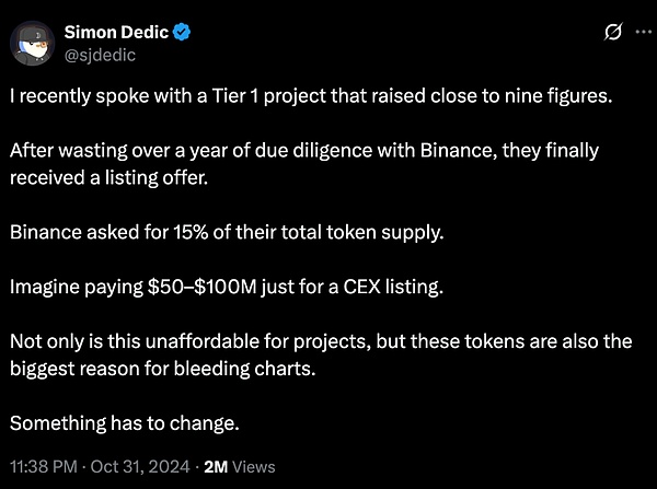 一些行业观察人士指出,一些资金雄厚的大型项目在币安的尽职调查过程中耗费了一年多的时间,最终收到的上市邀请却要求其放弃大量代币供应。这些类似股权的要求,仅仅为了进入交易所,就可能让项目花费数千万美元。